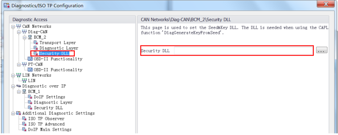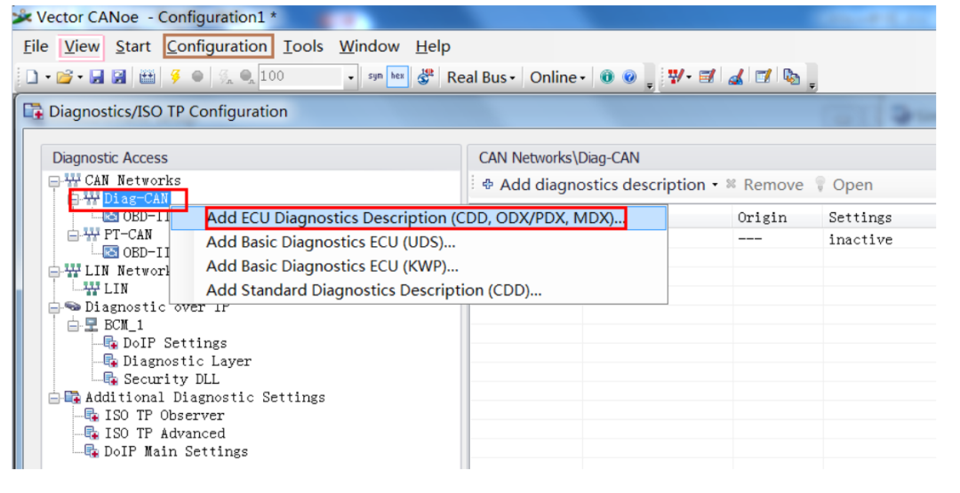 加载诊断功能的第一步,首先是需要在菜单栏 Configuration→Diagnotics/ISO TP..,弹出诊断配置窗口,在左侧栏的 CAN 网络上上右击, Add ECU…加载 cdd 诊断文件。