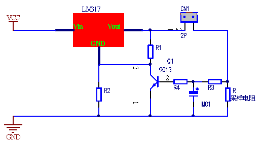 除些之外,还有采样电阻获取限流信号保护,下图是LM317限流保护电路,2P的连接器接负载,其中R是采样电阻,一旦电流过大,电容MC1充电,充电大于达到三极管9013的导通电压,LM317的输出电压降至它的基准电压之下,也可就是1.25V左右,从而保护负载。