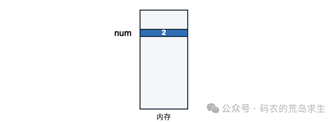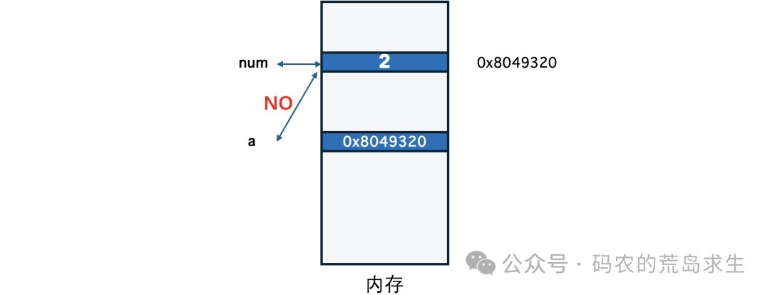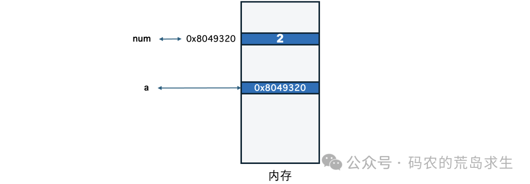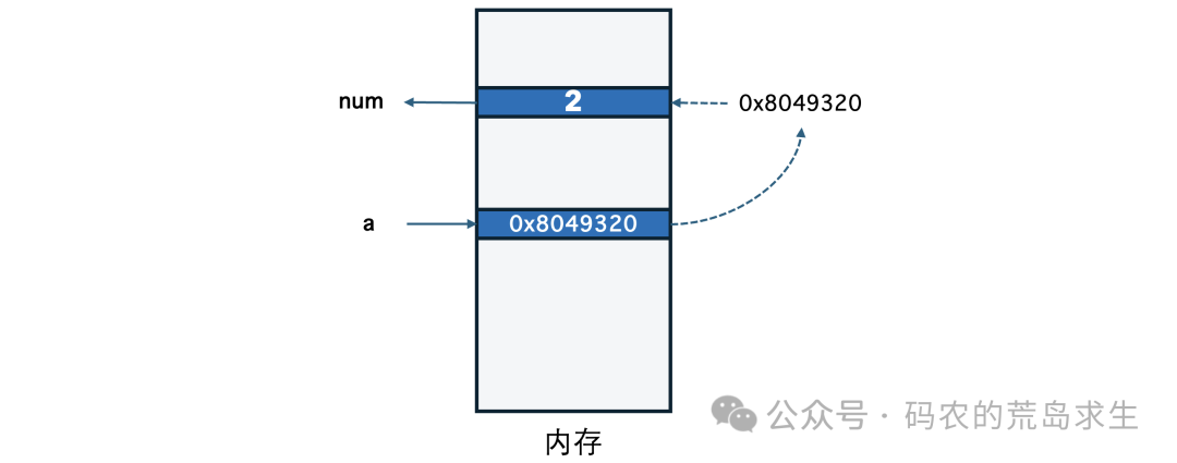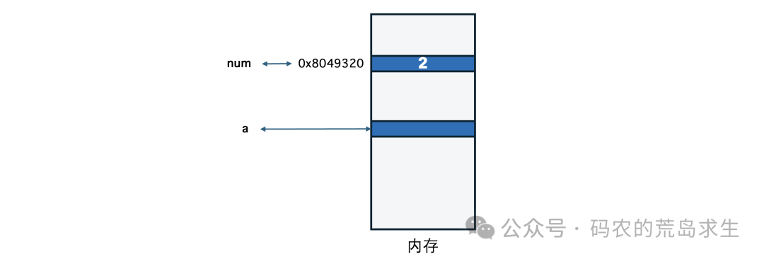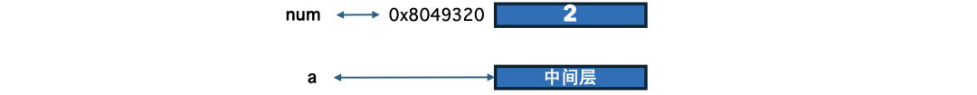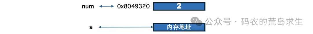 既然变量a没办法直接关联到num,那就曲线救国,变量a保存2所在的内存地址,也就是变量num的内存地址: