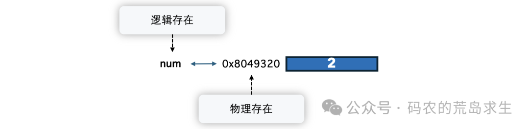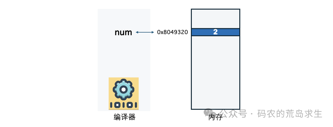 当然这是在编程语言层面的理解,在真实的内存中可不存在一个叫做num的符号,而是内存地址0x8049320这个地方保存了数字2: