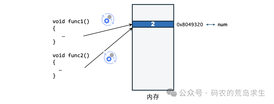 以C语言为例,现在有两个函数都需要对变量num执行加1操作: