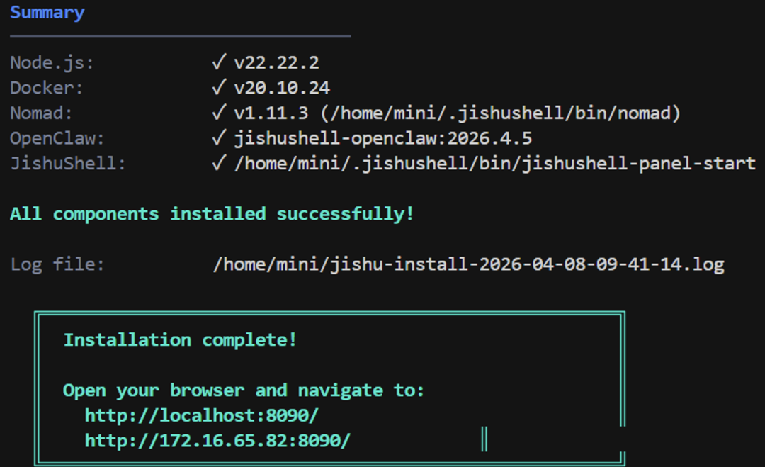 在此芯P1平台上,执行上述命令后即可全自动部署,系统最终提示“All components installed successfully!”即表示部署成功。