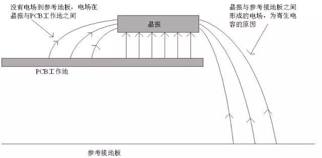 从图中可以看出,当晶振布置在PCB中间,或离PCB边缘较远时,由于PCB中工作地(GND)平面的存在,使大部分的电场控制在晶振与工作地之间,即在PCB内部,分布到参考接地板的电场大大减小,导致辐射发射就降低了。