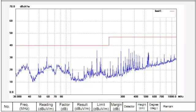 将晶振内移,使其离PCB边缘至少1cm以上的距离,并在PCB表层离晶振1cm的范围内敷铜,同时把表层的铜通过过孔与PCB地平面相连。经过修改后的测试结果频谱图如下,从图可以看出,辐射发射有了明显改善。