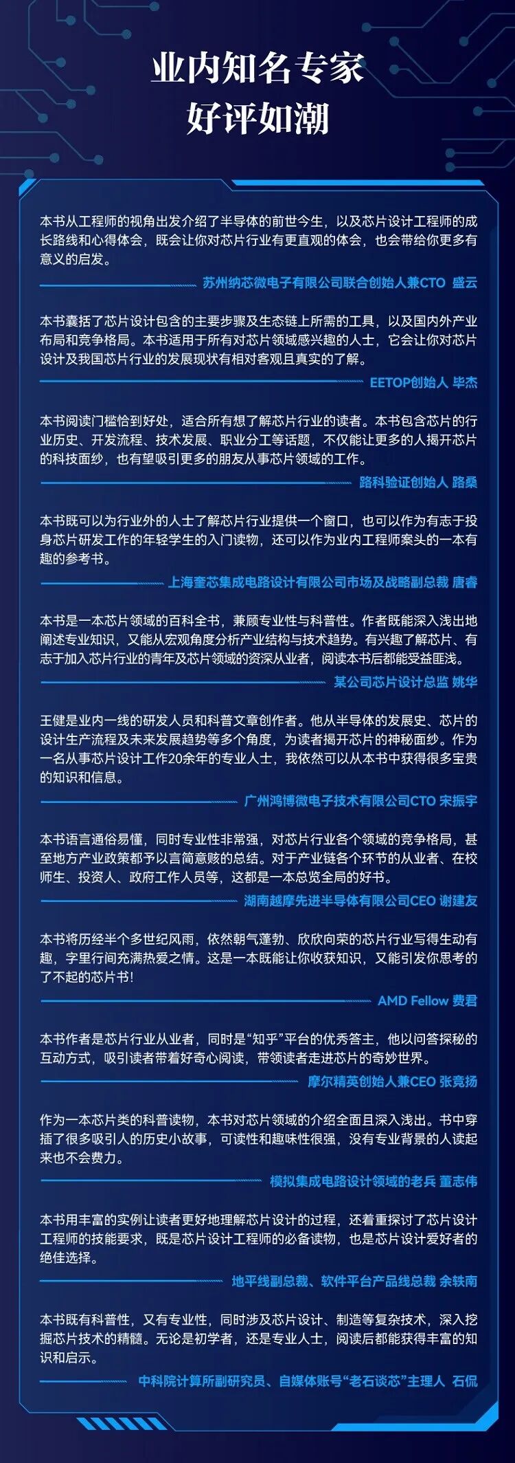 基于此背景,我更希望有一本书,能向读者更全面、更深入地介绍芯片,更直观地展示这个行业,以独特的视角带领读者漫步芯片波谲云诡的发展史、理解芯片的运作机理、了解中国的芯片产业,更重要的是让大家知道如何进入这个行业,站在“半导体巨人”的肩膀上,博浪前行......