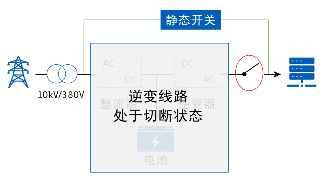 市电输入后经由旁路直接为负载提供交流电,逆变器处于断开状态。当市电出现故障,旁路关断后接通逆变器线路,开启电池逆变工作模式,为负载持续供电。