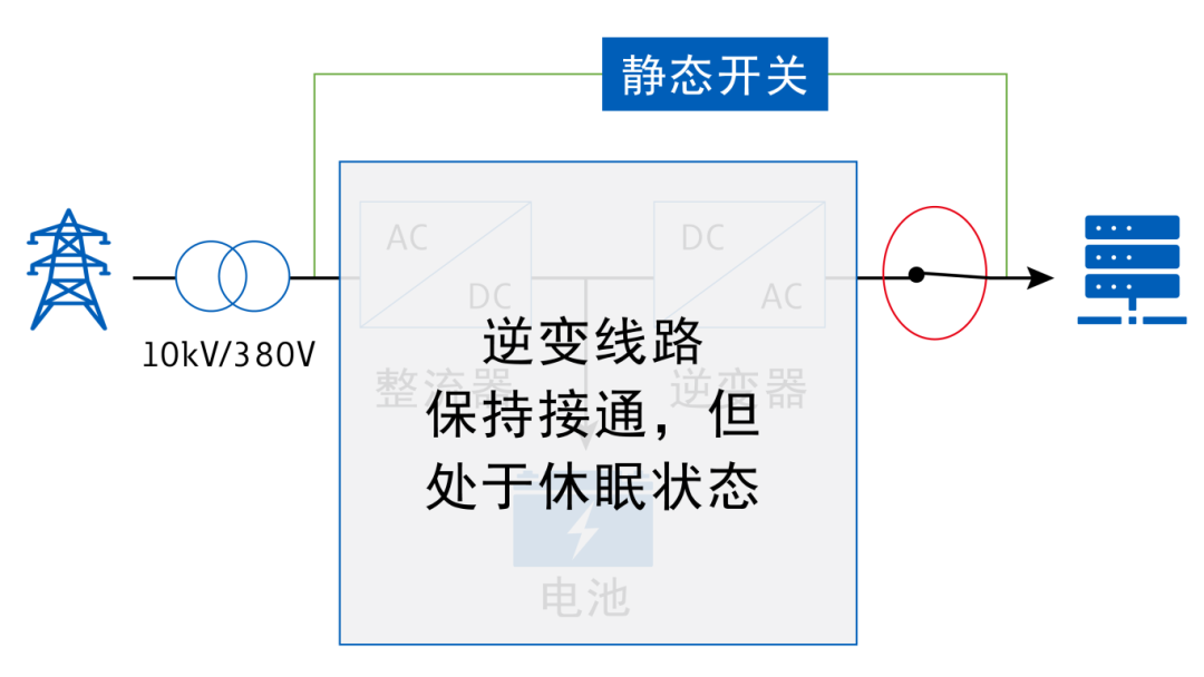 优势:实现”零级变换”,整机效率可高达 99%,切换时间几乎为 0ms。整流器和逆变器等元件轻载,降低整体故障率。