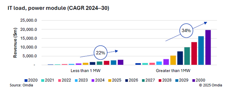 在AI大模型与高性能计算(HPC)的快速迭代驱动下,数据中心基础设施正经历效率与可靠性的双重变革,预制模块化数据中心作为适配数字化转型的核心载体,市场规模持续高速增长。Omdia《2025 预制模块化数据中心市场分析》报告明确显示,2024 年起电源模块(Power Module)已占据预制模块化数据中心市场超 65% 的份额,预计 2030 年电源模块市场规模将突破 226.8 亿美元,年复合增长率高达 32%,成为市场扩容的核心引擎。Omdia 在报告中指出:数据中心电源模块,恰逢其时,全球所需(Power modules for data centers: Right timing, global appeal)。