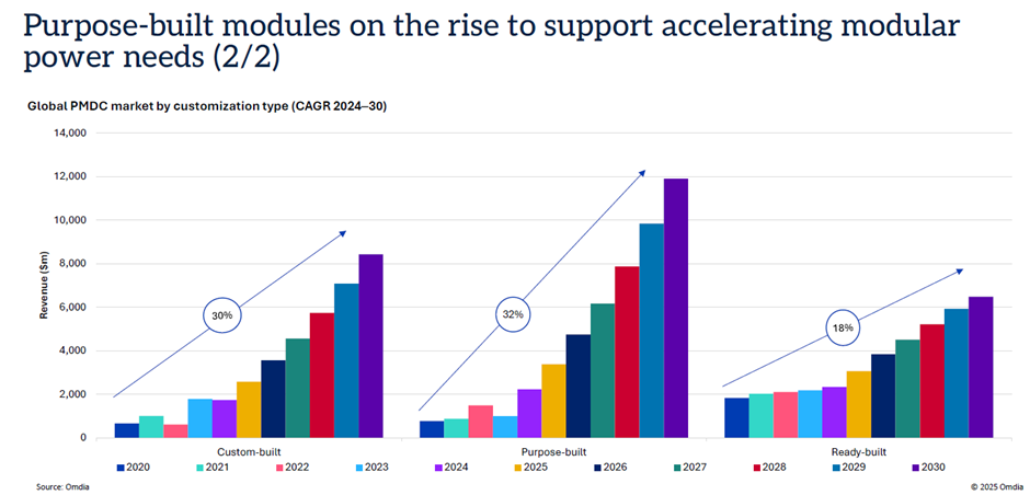 在 AI 大模型与 HPC 驱动下,预制模块化数据中心(PMDC)进入加速发展阶段。Omdia 报告显示,电源模块已占据预制化数据中心市场 65% 以上份额,并将在未来数年保持 30% 以上年复合增长率,成为行业结构重构的核心力量。