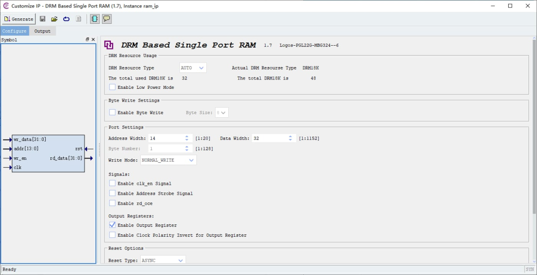 PGL22GB RAM IP 核配置:16KB 容量,32 位数据宽度