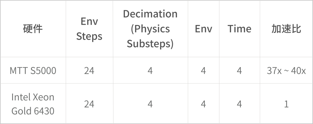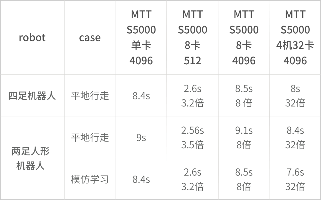 ▼四足机器狗训练:在宇树Go2四足机器狗平地运控任务中,MTT S5000单卡处理4096个仿真环境仅需7~8 秒,相较多核CPU的280~300秒,实现最高约40倍加速,单卡1小时完成收敛,大幅缩短了训练周期。