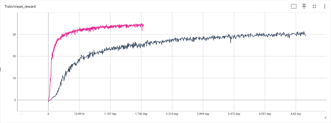 图注:分布式加速性能。表中“时间”为单步仿真耗时,“倍数”为训练收敛加速比。如上表所示,采用数据并行(Data Parallelism)策略:每张GPU运行4096个env环境,一共同时计算8×4096 = 32,768个env,进行分布式并行仿真,收敛速度随GPU数量增加接近线性提升,而单次迭代耗时基本不变。
