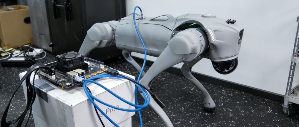 图注:正在进行策略部署调试中的机器狗,端侧控制采用摩尔线程长江SoC芯片。
