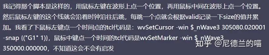 #设定左键锚定的时间线按上升沿跳转wvSetSearchMode -win $WaveID -posedge#让左键锚定的时间线跳到下个沿wvSearchNext -win $WaveID#获得当前时间点的时间,"1 315000 x 1ns"形式wvGetCursor $WaveID -time