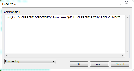 2.按F6,输入:cmd /k cd "$(CURRENT_DIRECTORY)" & vlog.exe "$(FULL_CURRENT_PATH)" & ECHO. & EXIT (直接复制,注意不要删掉空格,还不成功则中间vlog.exe前加上vlog.exe的路径)保存,命名为:Run Verilog