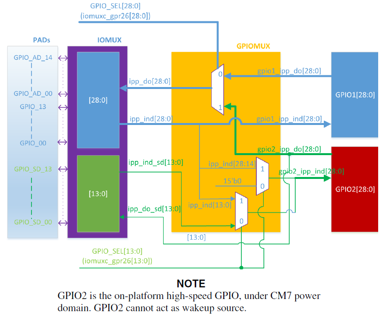 IOMUXC_GPR->GPR27 IOMUXC_GPR->GPR28 IOMUXC_GPR->GPR29 | GPIO_MUX1 GPIO_MUX2 GPIO_MUX3 GPIO_MUX4 | GPIO1与GPIO6 GPIO2与GPIO7 GPIO3与GPIO8 GPIO4与GPIO9 | | i.MXRT1160/1170 | IOMUXC_GPR->GPR40、41 IOMUXC_GPR->GPR42、43 | GPIO_MUX2 GPIO_MUX3 | GPIO2与CM7_GPIO2 GPIO3与CM7_GPIO3 |