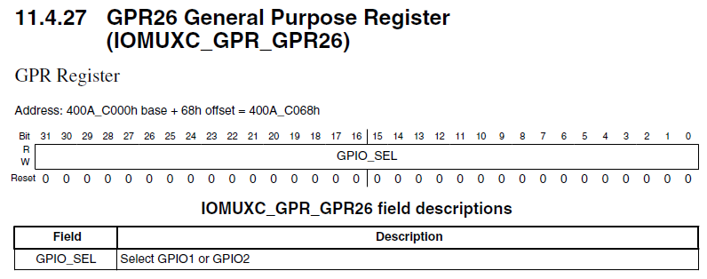 具体 GPIO 映射功能是由 IOMUXC_GPR26 寄存器来控制的(注意这是个软复位不置位的寄存器)。比如当 GPIO_11 被配置为了 GPIOMUX_IO11 功能时,那么 IOMUXC_GPR26[11] 决定了其映射关系: