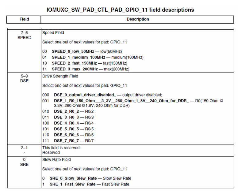 继续以 i.MXRT1010 为例,每个 PAD 在 IOMUXC 模块里都有一个专门配置电气属性的寄存器 IOMUXC_SW_PAD_CTL_PAD_xxIO,选取 GPIO_11 的相应配置寄存器为例,组合其中 SRE、DSE、SPEED 位可以得到不同运行速度(具体组合值可在参考手册 GPIO 章节搜索 Operating Frequency 小节查看),不过我们能看到 PAD 最大运行速度是 200MHz: