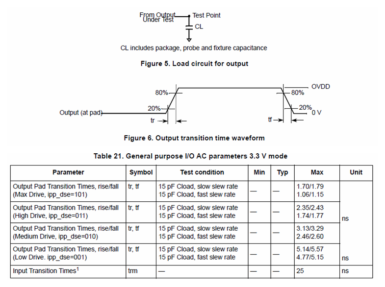 在 i.MXRT1010 数据手册里,我们还可以看到更具体的 I/O 翻转时间测试:
