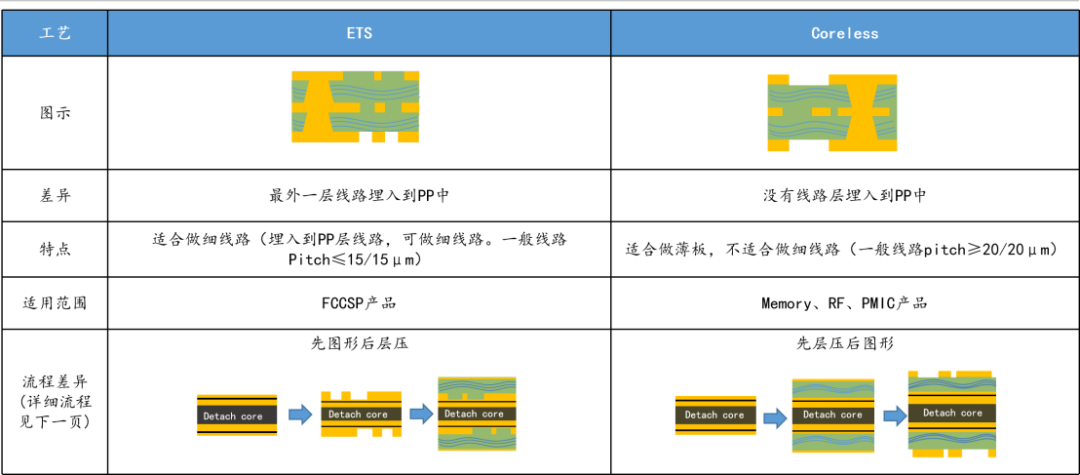 在行业通用的载板制造领域中,除了减成法(Tenting)、改良型半加成法(mSAP)、半加成法(SAP)这三种主流核心技术路线外,还包含无芯工艺(Coreless)、嵌入式线路工艺(ETS,即 Embedded Trace Substrate/Embedded Pattern Process)、无芯铜柱法工艺(Via Post Coreless)等特殊工艺。