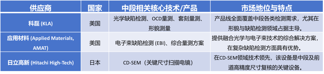 中段量检测设备市场延续了行业高度集中的格局,主流设备供应商与前段高度重叠,前三名供应商合计占据全球约75%的市场份额。