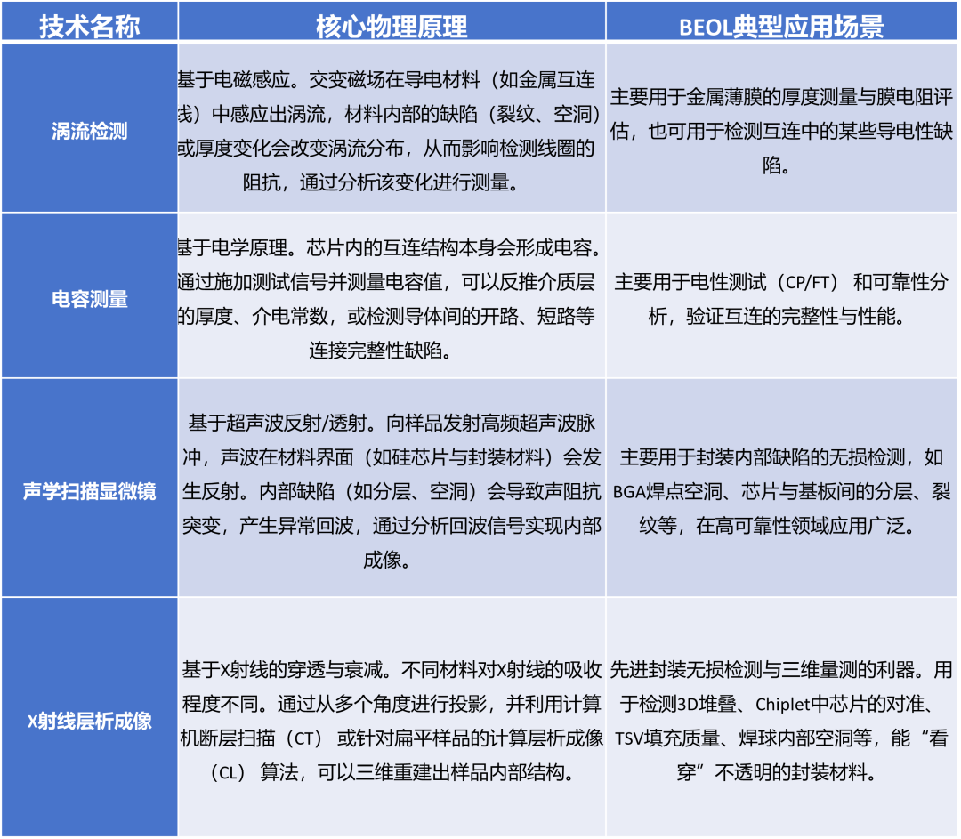 为应对上述复杂的检测需求,BEOL广泛采用多种物理原理的检测技术,尤其在应对先进封装的内部结构时,无损检测技术至关重要。