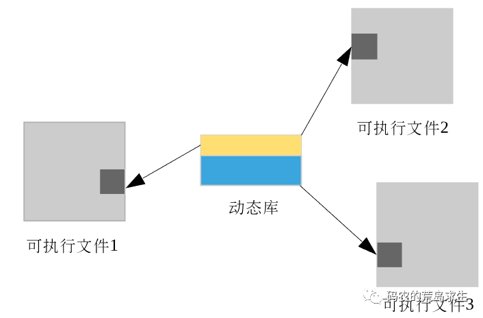 从上面这张图中可以看出,动态库的使用解决了静态链接当中可执行文件过大的问题。我们在前几节中将静态链接生成可执行文件的过程比作了装订一本书,静态链接将引用的其它人的著作也装订到了书里,而动态链接可以想象成作者仅仅在引用的地方写了一句话,比如引用了《码农的荒岛求生》,那么作者就在引用的地方写上“此处参考《码农的荒岛求生》”,那么读者在读到这里的时候会自己去找到码农的荒岛求生这本书并查找相应的内容,其实这个过程就是动态链接的基本思想了。