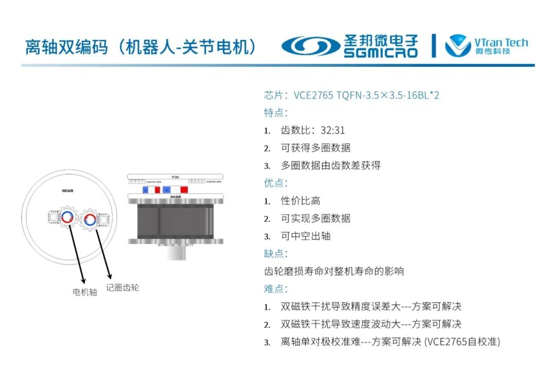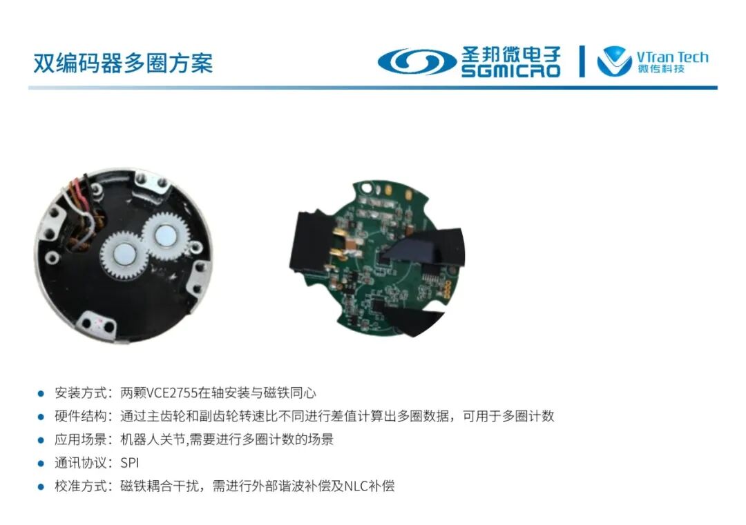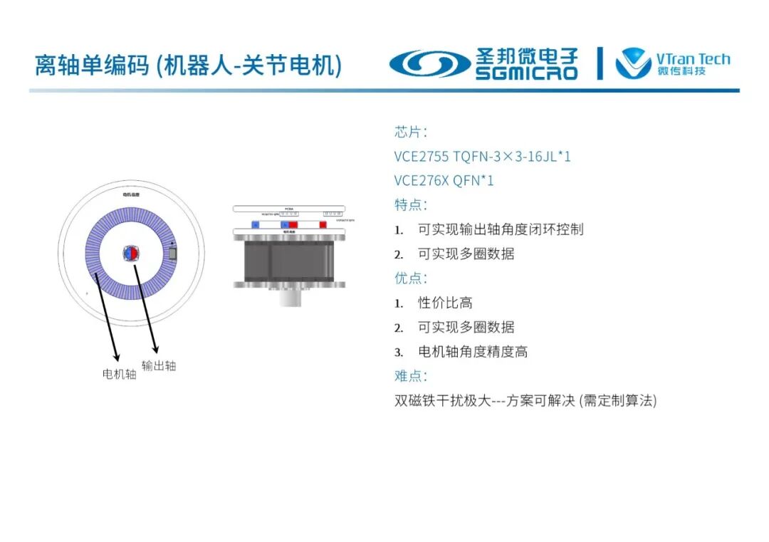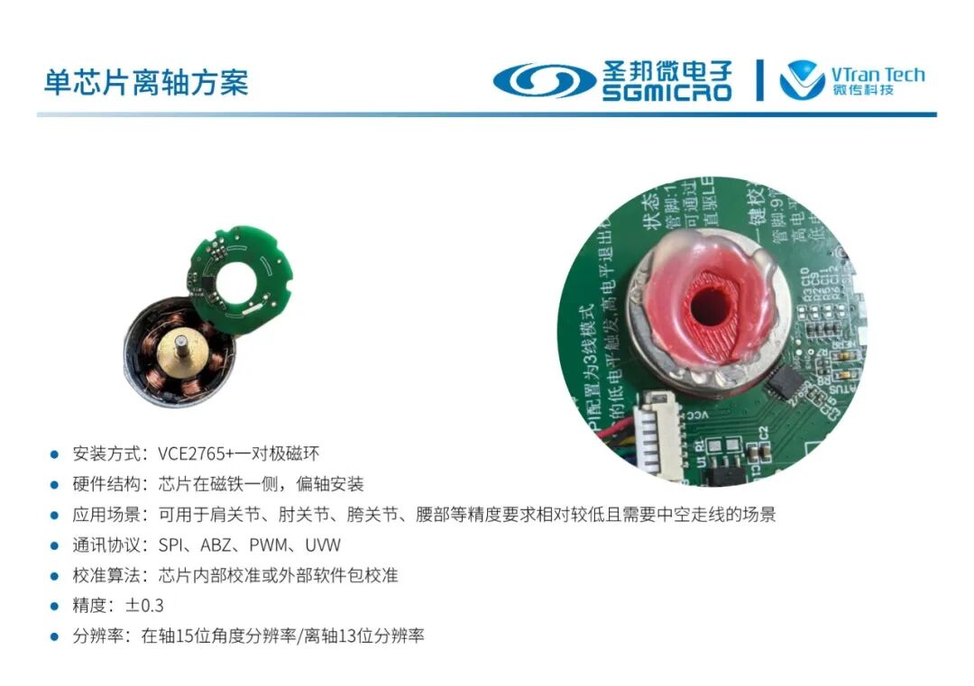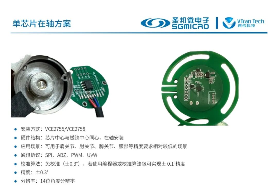 多种芯片组合可以实现在轴单编码、离轴单编码、在轴双编码、离轴双编码、在轴+离轴双编码等多种机器人关节应用方案,满足不同的电机结构。