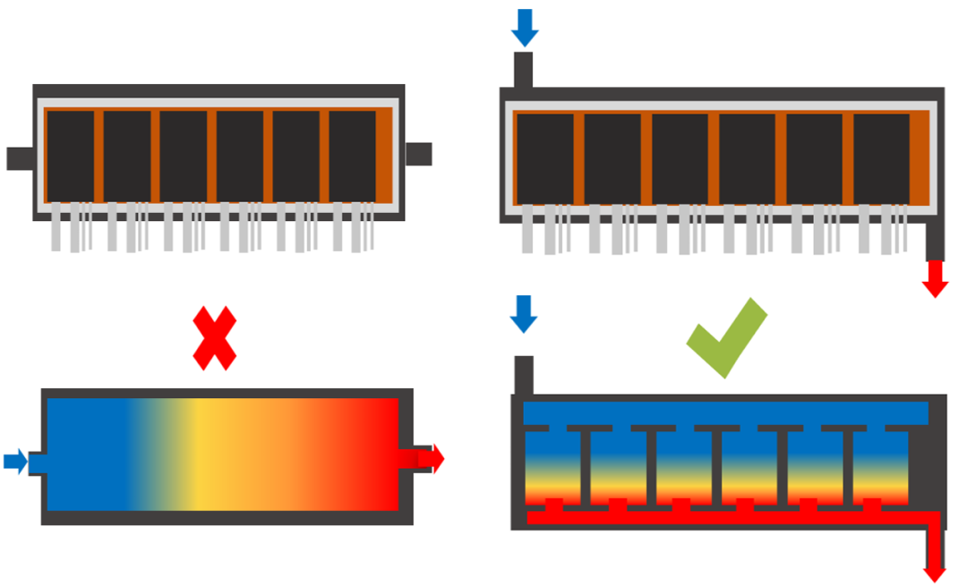 散热路径的不对称,也会对并联均流造成很大影响。在下面的例子中,并联的单管器件在散热器上左右放置,冷却液左进右出,会造成从左至右明显的温度梯度。改善后的布局,冷却液上进下出,并增加了扰流槽,温度梯度呈上下分布,左右两边的器件散热环境一致。