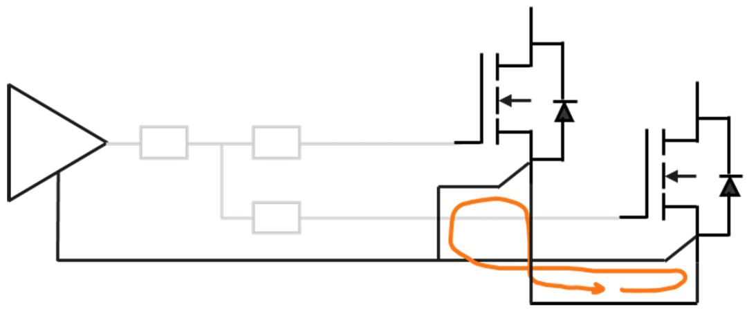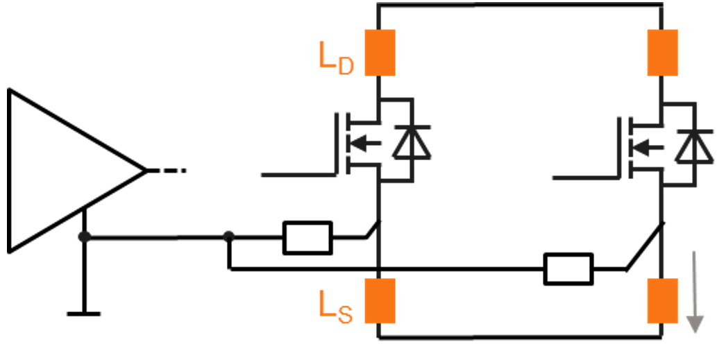 下图给出了源极回路不对称的常见案例。对于插件式封装,比如TO247,管脚长度不一致,就会造成源极电感失配。