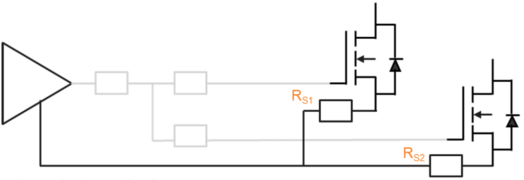 带有辅助源极的器件并联,辅助源极会形成电流回路,可以使用发射极限流电阻Rs,抑制源极电阻环流。