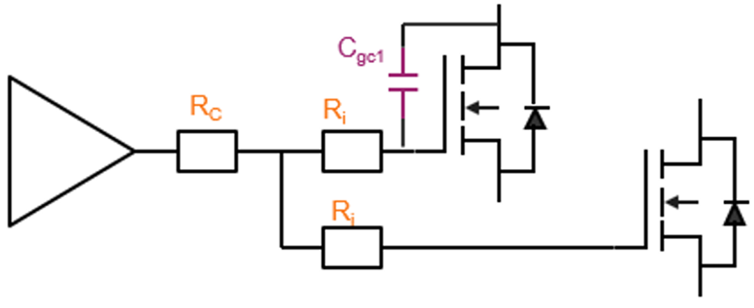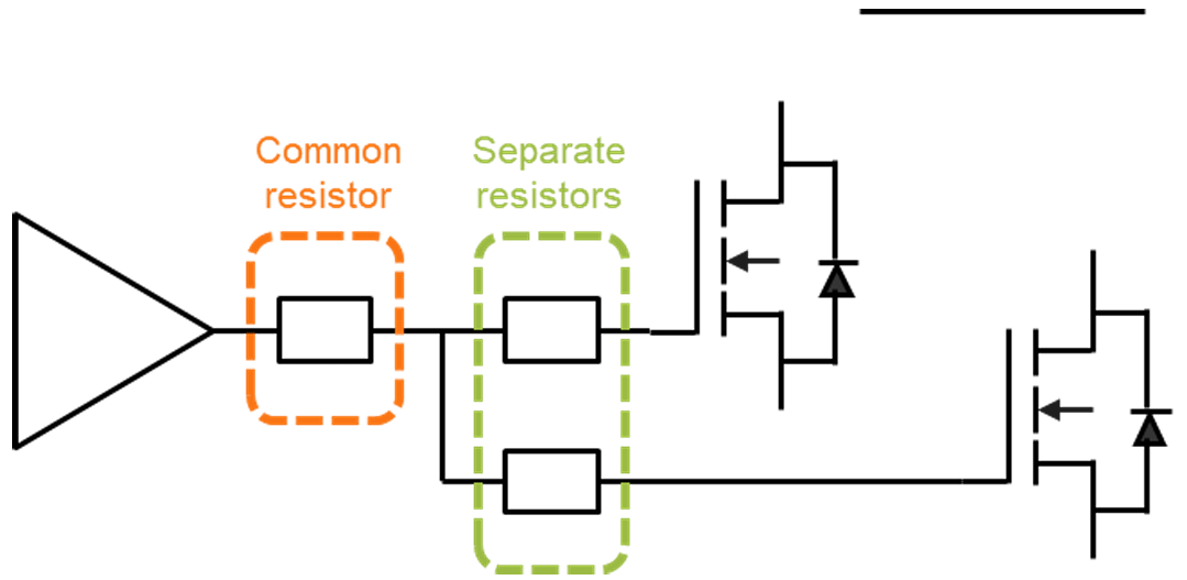 栅极电阻分为共同电阻Rgcom(下图的Common resistor),和独立电阻Rgi(下图的Separate resistors)。共同电阻Rgcom可以抑制阈值Vth/Cgc/Cgs失配引起的动态电流不均衡,独立电阻Rgi可削弱并联芯片间的振荡。