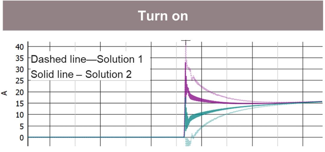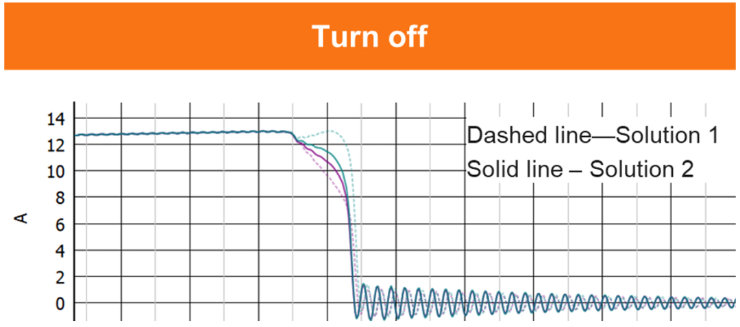 通过仿真可得开通和关断的波形,虚线为方案1,可见开关瞬间两管间电流偏差较大。第二种方案将共同电阻Rc提升至4Ω,而独立电阻Ri降低至2Ω,如实线所示,动态均流有了很大改善。