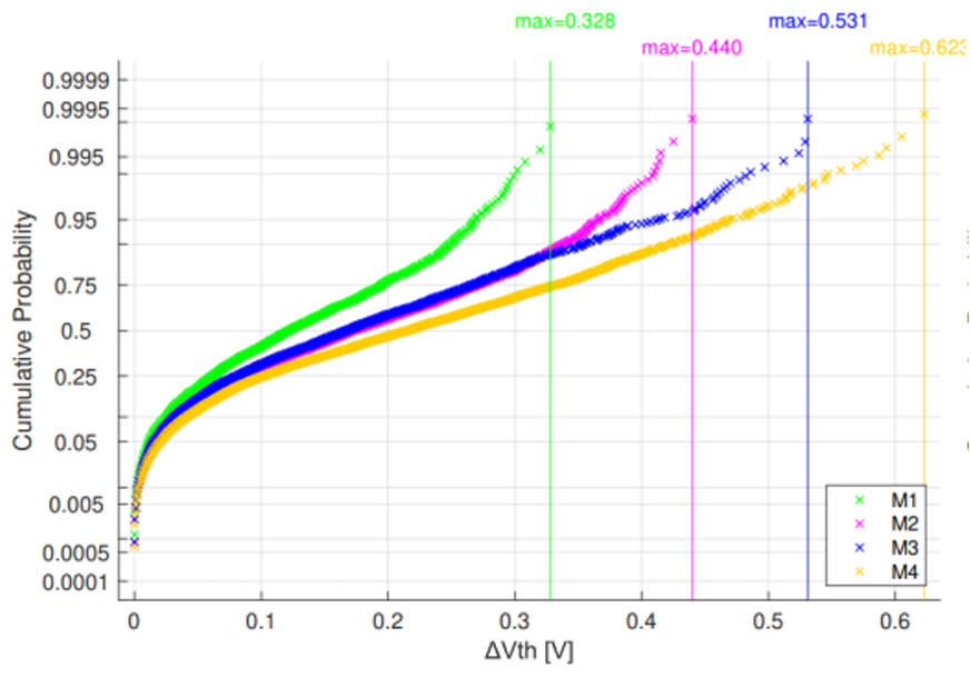 英飞凌SiC MOSFET阈值电压具有高度一致性。我们测试了4个品牌的各70pcs器件的阈值电压,其中M1是英飞凌的器件。可以看到,英飞凌最大的阈值偏差仅为0.3V,75%的器件偏差值在0.2V以下,明显低于其它厂家,其中M4偏差最大,达到了0.6V,是英飞凌的两倍。