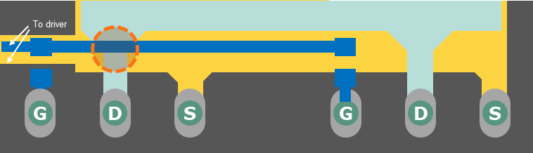 在下图的示例中,右边的器件的栅极引线与漏极引线交叠,这里就会产生一个额外的寄生电容Cgc。