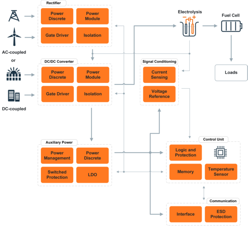 功率转换是氢电解槽系统的关键环节,它将电源中的电能转换为电解所需的能量形式。关键元器件包括整流器和DC-DC转换器,它们能够高效地管理和转换电能。功率模块解决方案将这些元器件集成到统一的系统中,采用模块化设计以实现可扩展性,配备有效的散热管理系统以降低热量,并采用先进的控制系统以实现最佳性能和安全性。