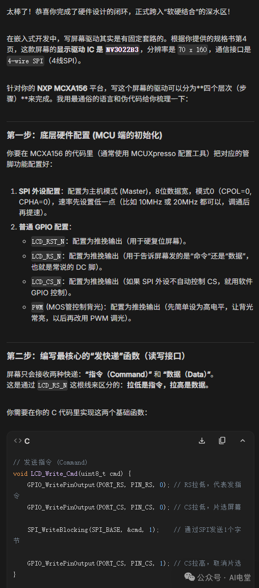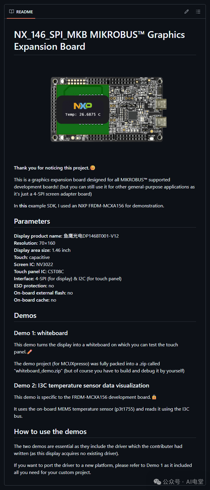 有AI和朋友的帮助,这样一个小制作不到一周便从想法到落地实现。熟悉我文章的朋友们肯定知道我一般会放代码进来的,不过为了压缩文章的长度,最后决定不放,有需要的请访问我的代码仓库。我在Github仓库里上传了两个demo工程和该板卡的设计文件,需要的朋友可以根据我写的README搞清楚这个仓库里有什么。https://github.com/Nathan-Xi/NX_146_SPI_MKB-MIKROBUS-Graphics-Expansion