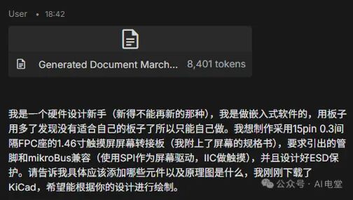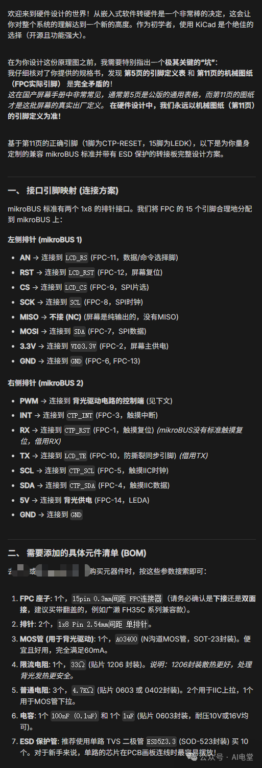 在我的常识中,如果需要开始设计PCB,首先需要绘制原理图,再根据原理图出具PCB的设计文件。我首先下载了我有点印象的EDA软件(KiCad)。至于屏幕的选择,我选择了一块性价比极高的1.46寸裸屏(只要9块钱!),代价就是除了规格书以外没有任何资料。在这之后我将基本情况交代给了Gemini。