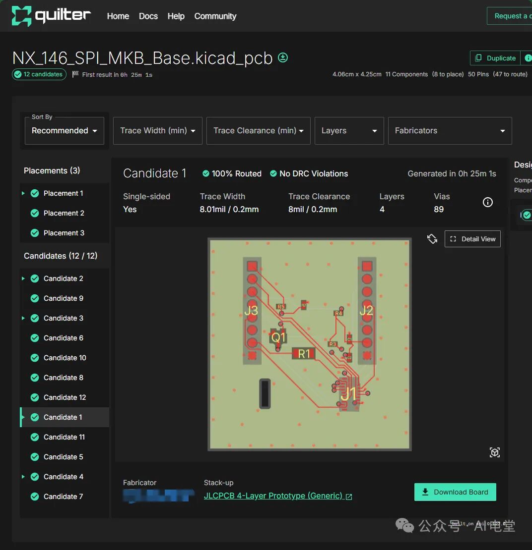 到了layout这部分,我首先根据MIKROBUS的datasheet固定了几个焊盘位置,最后剩下的,我尝试使用了Quilter帮我做单面焊盘的layout。