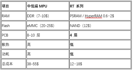 RT系列借此获得结构性成本优势,BOM成本显著低于部分高性能MCU和中低端MPU