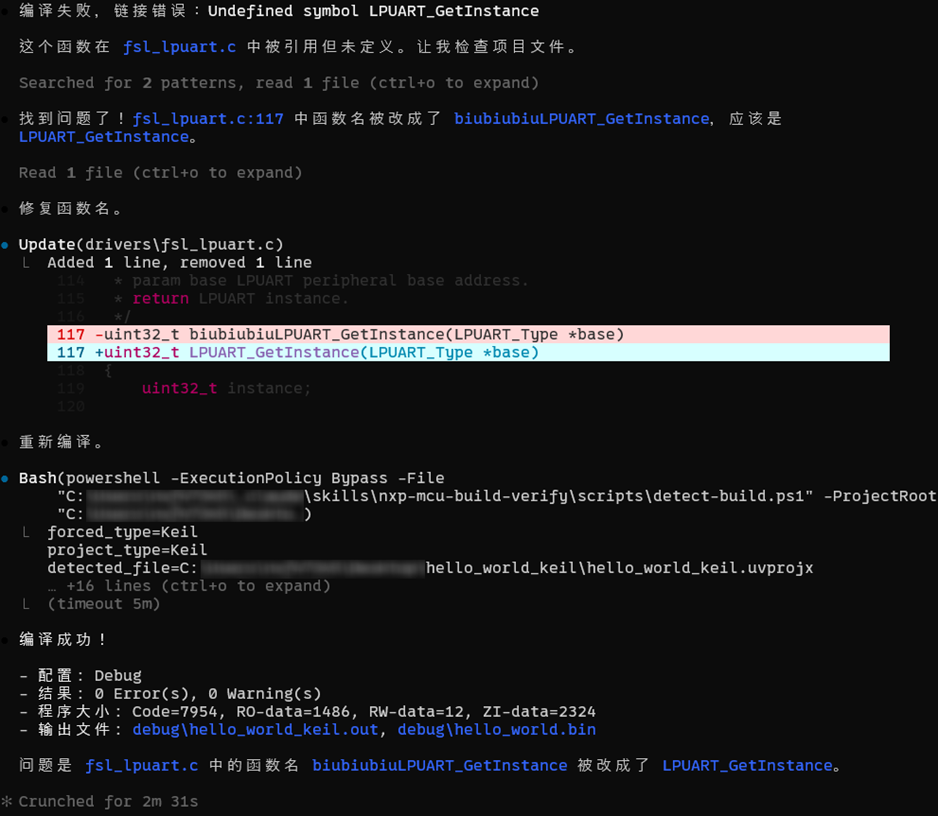 有了这个skill之后,再也不用手动将IDE的编译错误贴给coding agent了。现在coding agent可以自行编译,并且能直接根据编译结果进行排查,大大的提高了效率。这也让MCU开发离自动挡又近了一小小步。