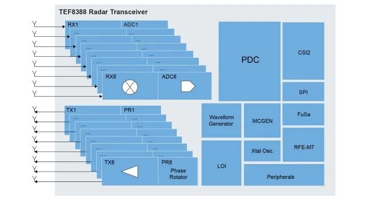 8T8R雷达收发器TEF8388支持多芯片级联,帮助OEM与Tier 1在统一平台架构上实现成像雷达的可扩展部署,从8T8R入门方案平滑扩展至32T32R高性能系统。