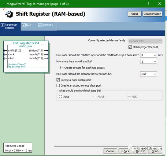 要想用实现均值滤波和中值滤波,必须要先生成3x3阵列,在Altera系列里,可以用QuatusII调用IP核——shift_RAM,具体设置参数如图所示。