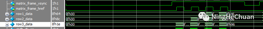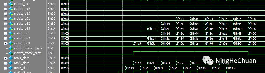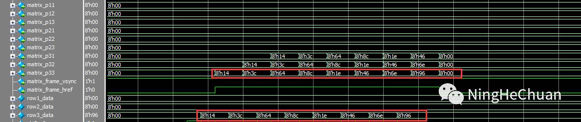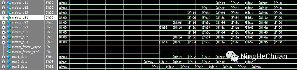 如图所示,我们这里将行设置为8,场设置为4,所以可以明显的看到,当数据缓存到一行时,就会移位寄存到下一行,缓存两行后便会生成3X3矩阵。
