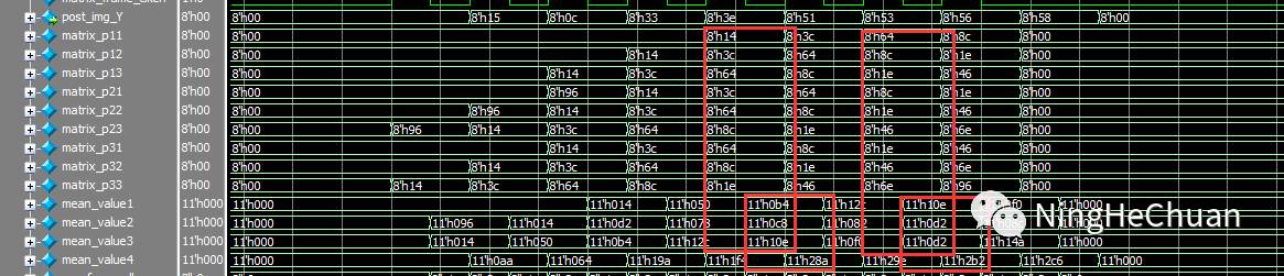 如图所示,将3x3矩阵的中心像素的周围八个点求和,我们上面还是采取了流水线的设计方法,来增加吞吐量,然后再求平均值代替目标像素的值,从波形图上观察,计算的结果显然是正确的。这样便完成了均值滤波的仿真。
