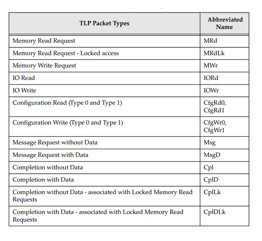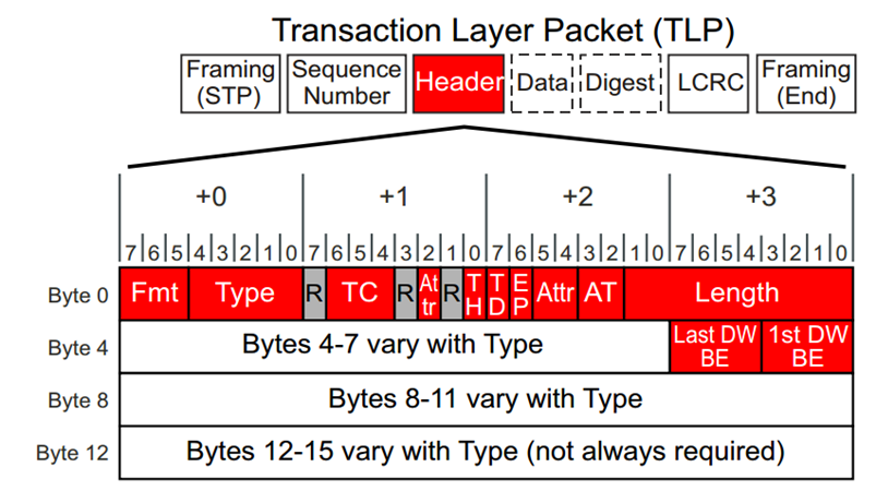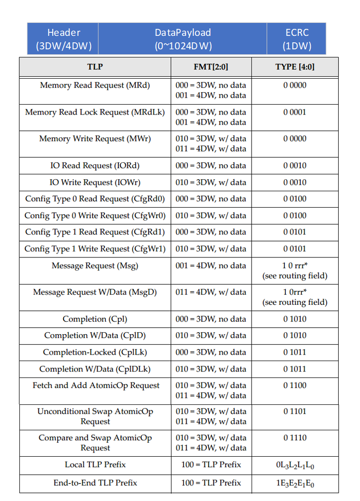 0表示无载荷(如MRd),1表示有载荷(如MWr)。 - • FMT[2] : 用于指示是否含有扩展头部,这是PCIe 3.0末期及PCIe 4.0的功能。通常可忽略并默认置