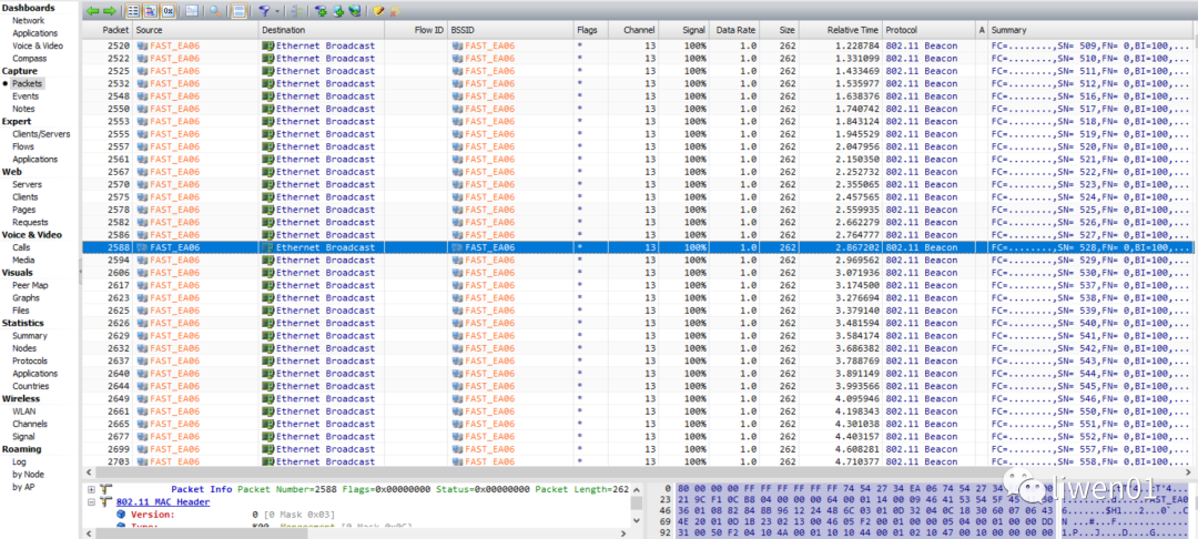 下图是使用抓包工具去抓路由器 beacon 广播包的情况,FAST_EA06 是路由器名