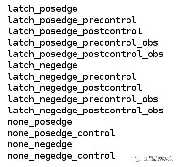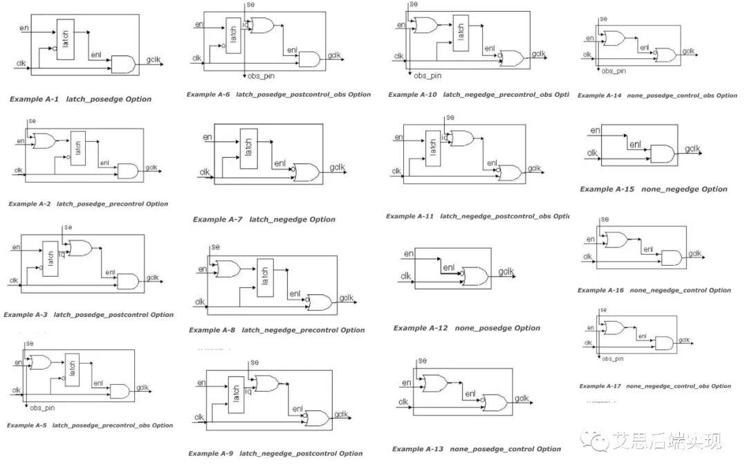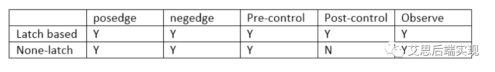 Posedge: o Latch based:clk负沿敏感的latch o None-latch:非或门结构的CG Negedge: o Latch based:clk正沿敏感的latch CG o None-latch:与门结构CG Pre-control: o Latch based : latch的EN输入前插入一个或门,从而带入TE的管控 o None-latch: 在组合逻辑的EN输入侧插入一个或门,从而带入TE的管控 Post-control: o Latch based : latch的output输出后插入一个或门,从而带入TE的管控 o None-latch: 不支持 Observe: o 再有pre/post control的设计中监控与门中非TS管控测的信号