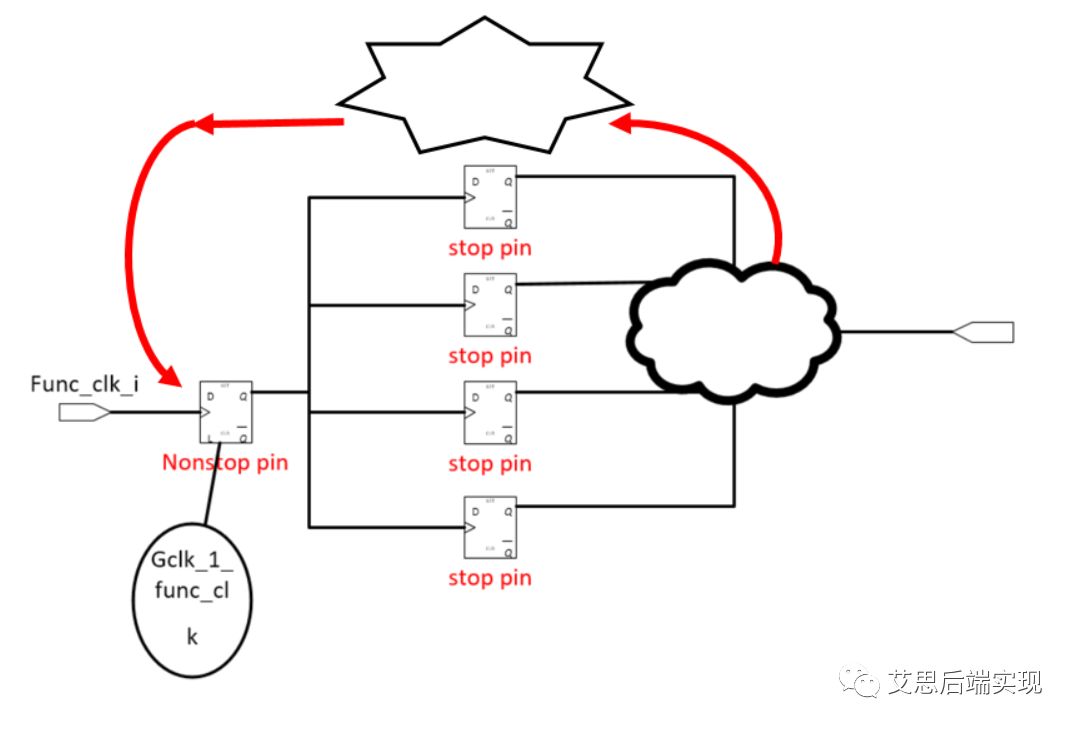 Clock_gating作为clock tree的一部分,在做layout的时候,有更多的因素需要考量 首先,所有的latch based CG都有一组setup/hold timing arc,就是clk –> EN的timing check 其次,在CTS的时候,clock-gating被当作了一个none-stop pin而非一个stop pin如下图示例: