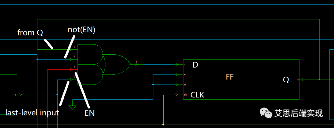 由于在没有使用CG之前,由于FF需要不停地刷新,DC为了保障FF的输出在EN端非使能的时候保持当前状态,所以一定有一条从Q到D的回路来保证FF的输出保持不变,类似下图